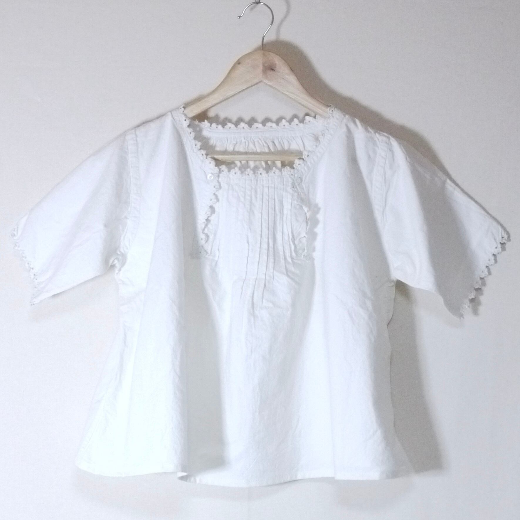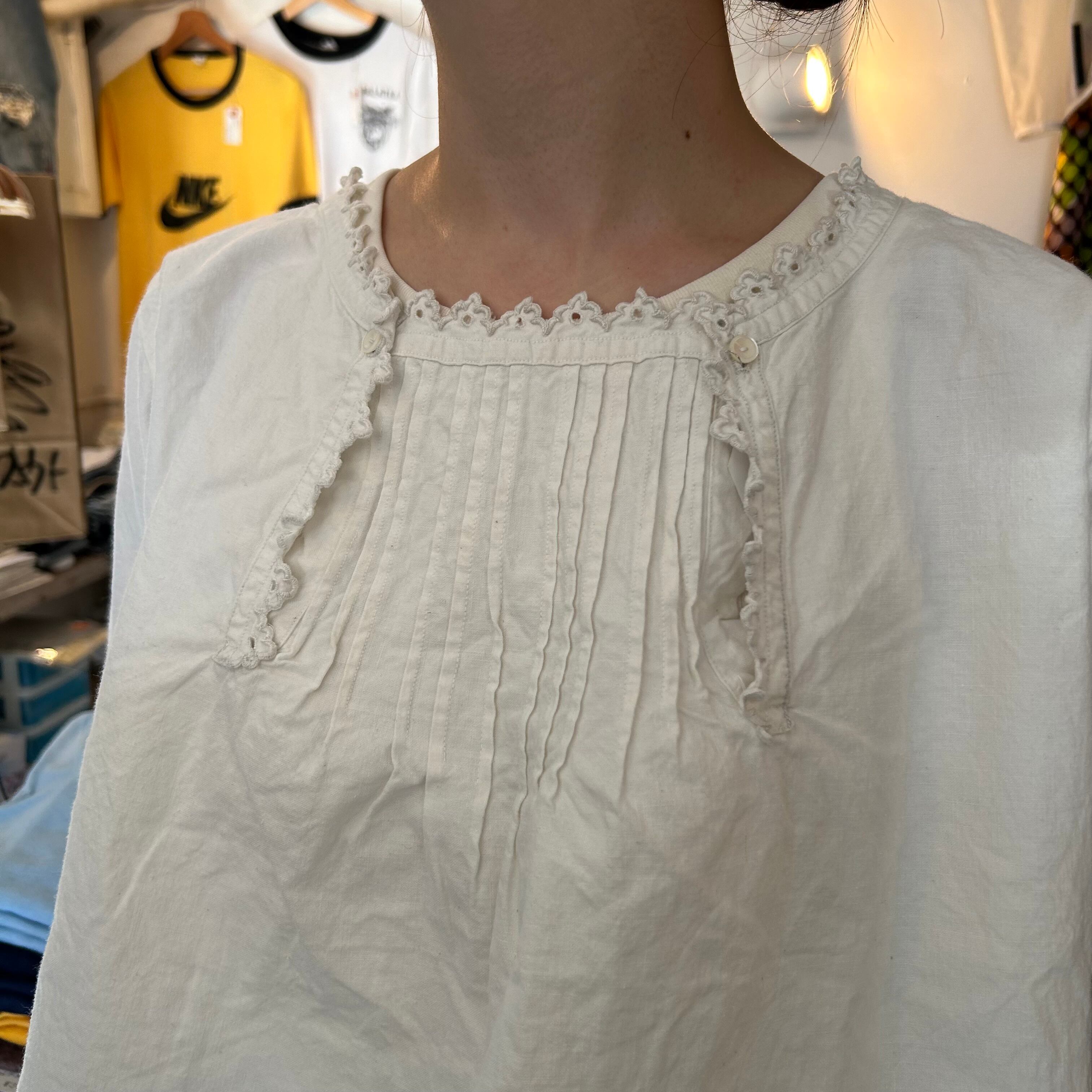 ネックデザインやバックネックのギャザー、レースが特徴的。