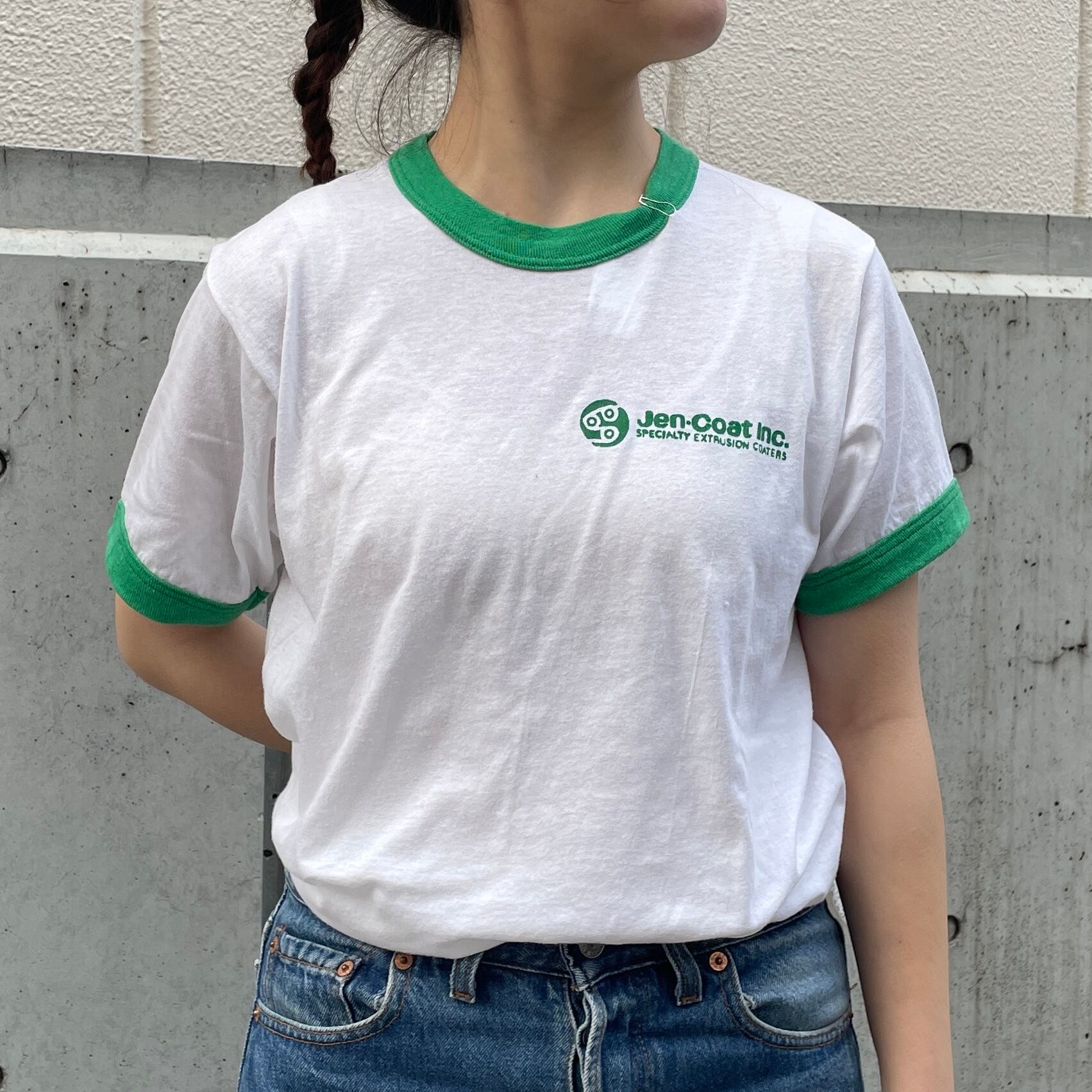 ホワイトカラーのボディにグリーンのリンガーTシャツ。