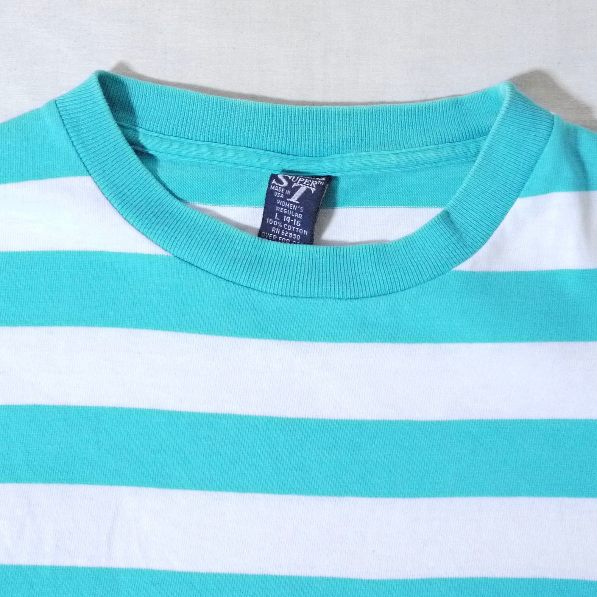 ライトブルー×ホワイトのボーダー柄ポケットTシャツ。