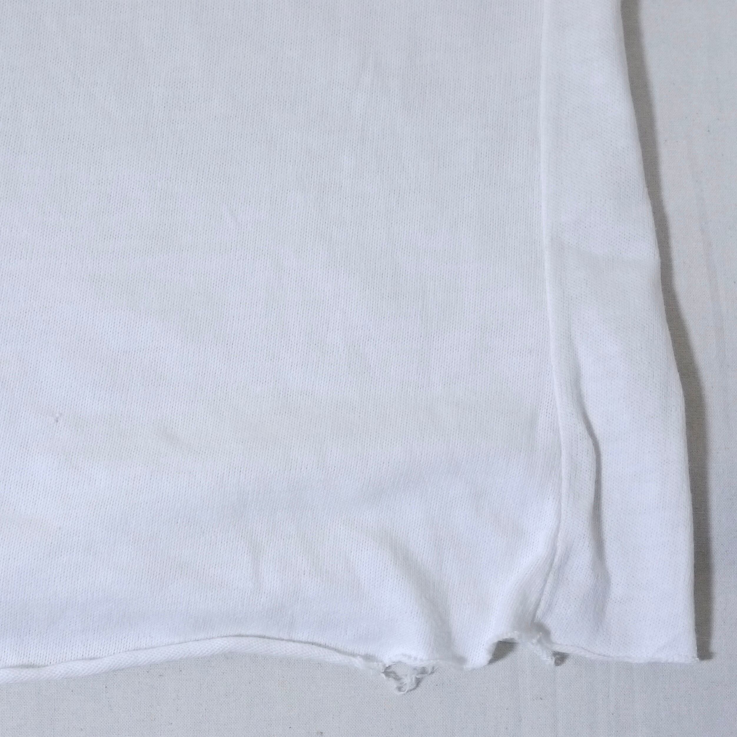 状態は、前後ともにネック周辺にスレからくるダメージ。左袖に小さな生地のほつれ。前身頃の裾付近にピンホール。両袖口に薄ら汚れ。前所有者によって裾が切られ、切りっぱなしになっています。経年による使用感はありますが、着用に問題はありません。コンディションをご理解頂きアジとして捉えて頂ける方にお願いします。