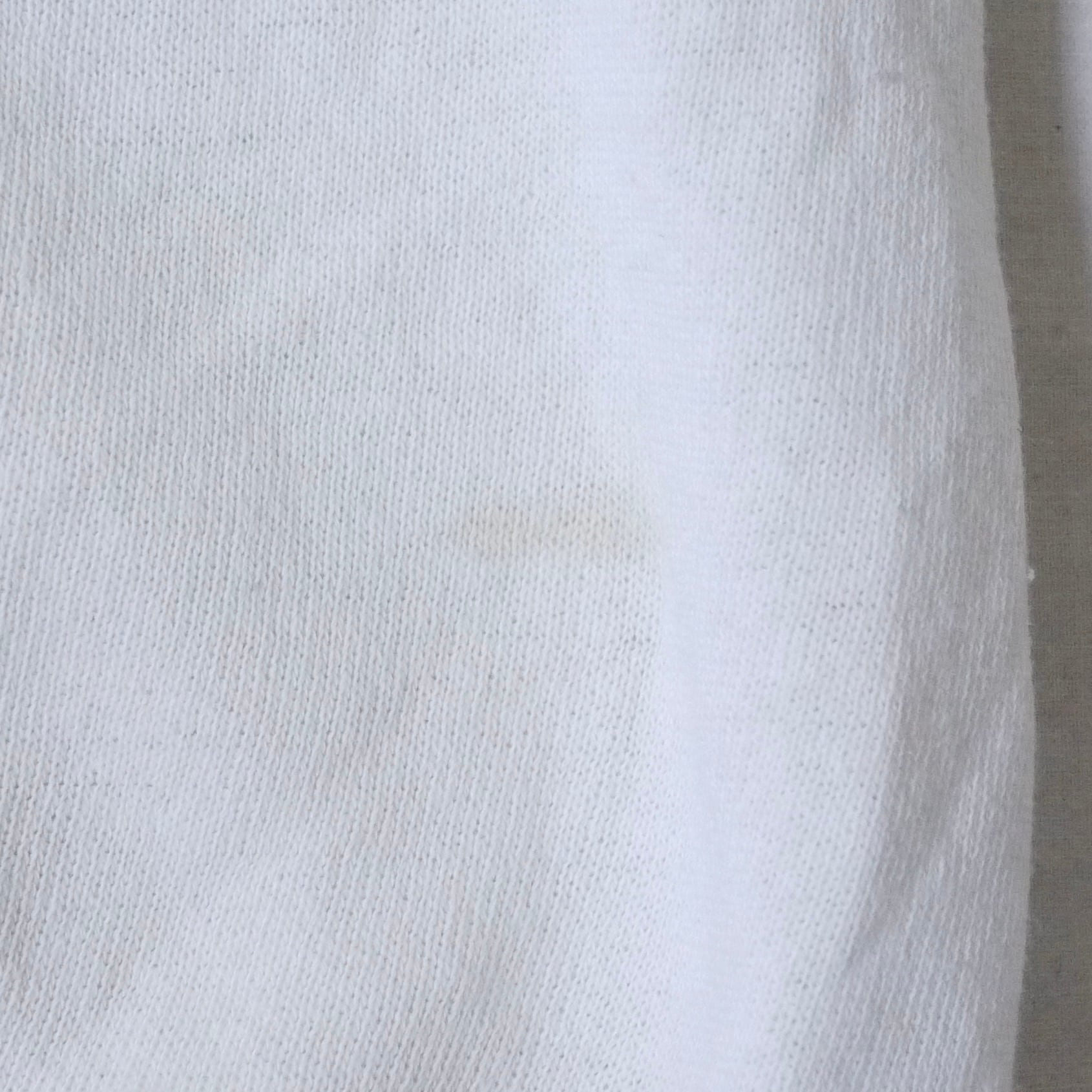 状態は、前身頃のプリント部分、下部に汚れ。前身頃の左脇付近に毛玉。後ろ身頃の左脇付近に汚れ。右袖に小さな汚れ。ネック、裾共にリブが伸びています。その他、経年による使用感はありますが、着用に問題はありません。コンディションをご理解頂き。アジとして捉えて頂ける方にお願いします。