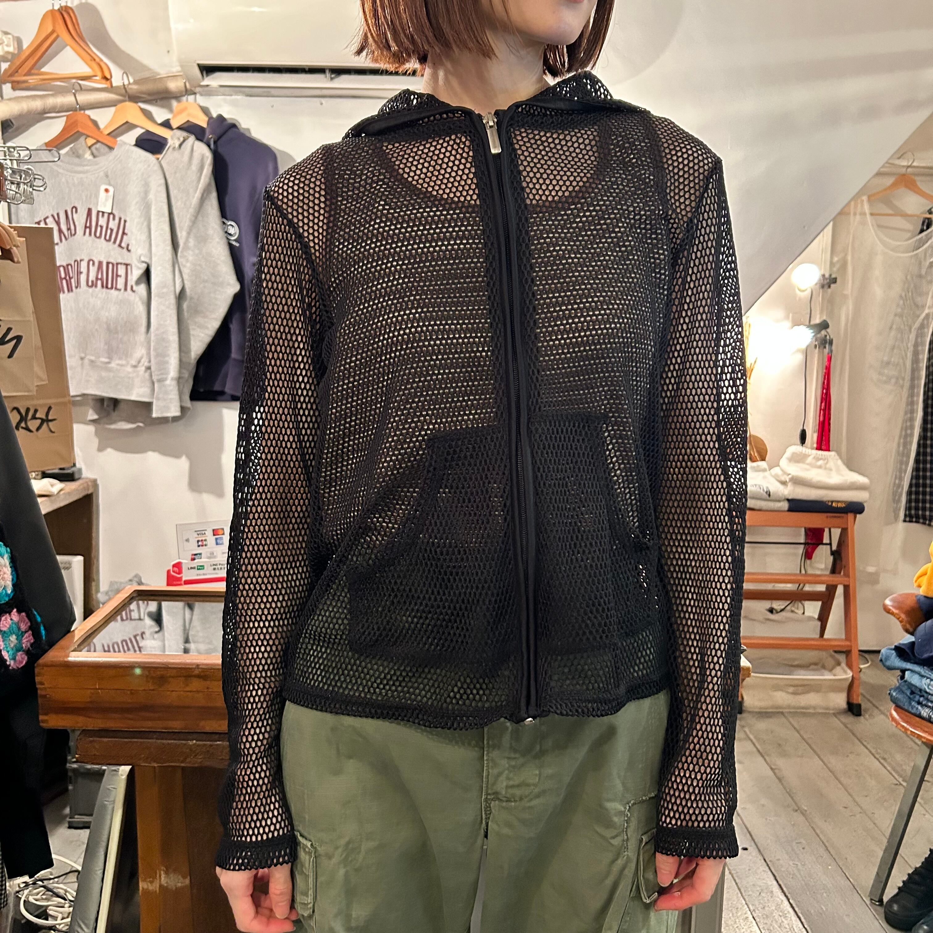 ブラックカラーのフード付きメッシュジャケット。