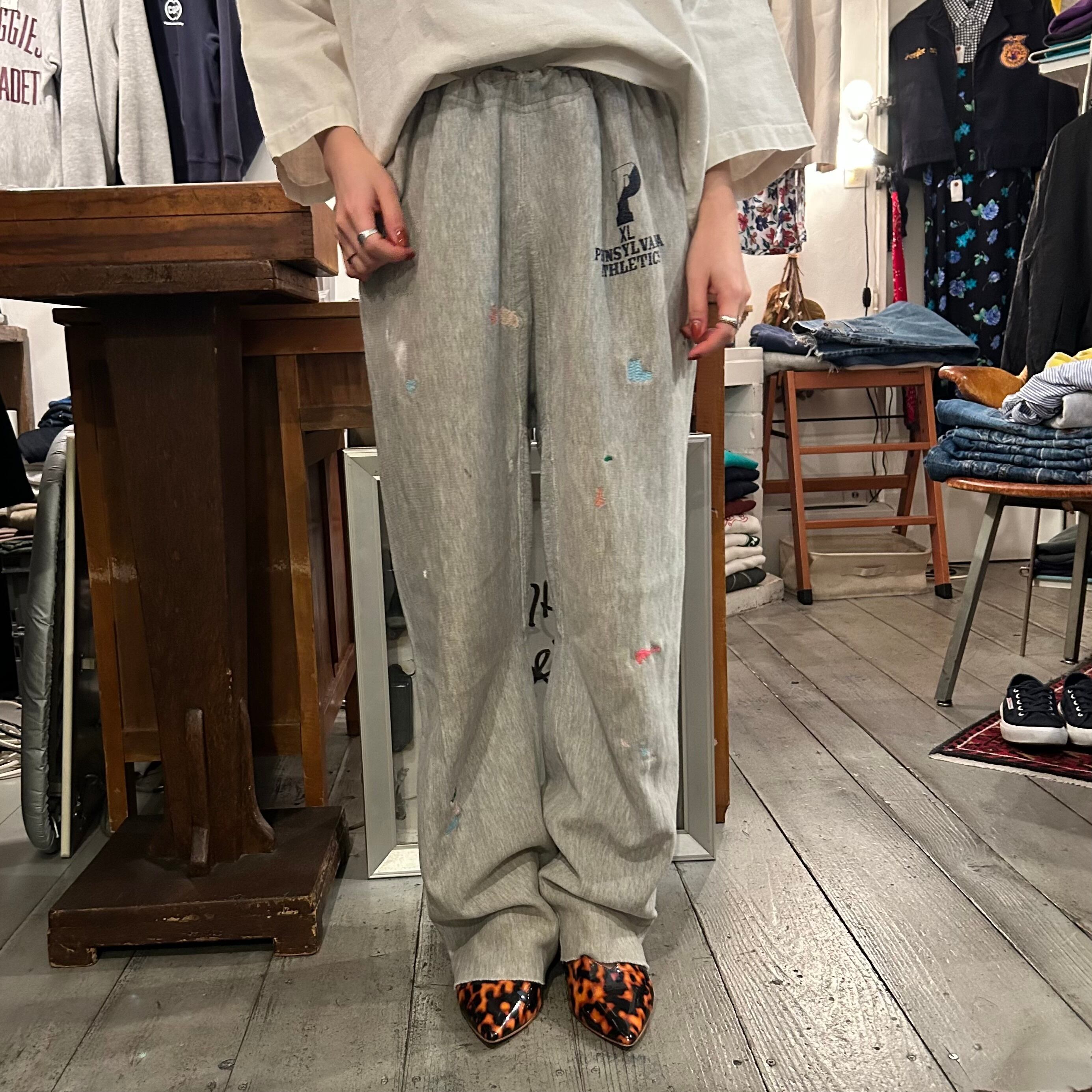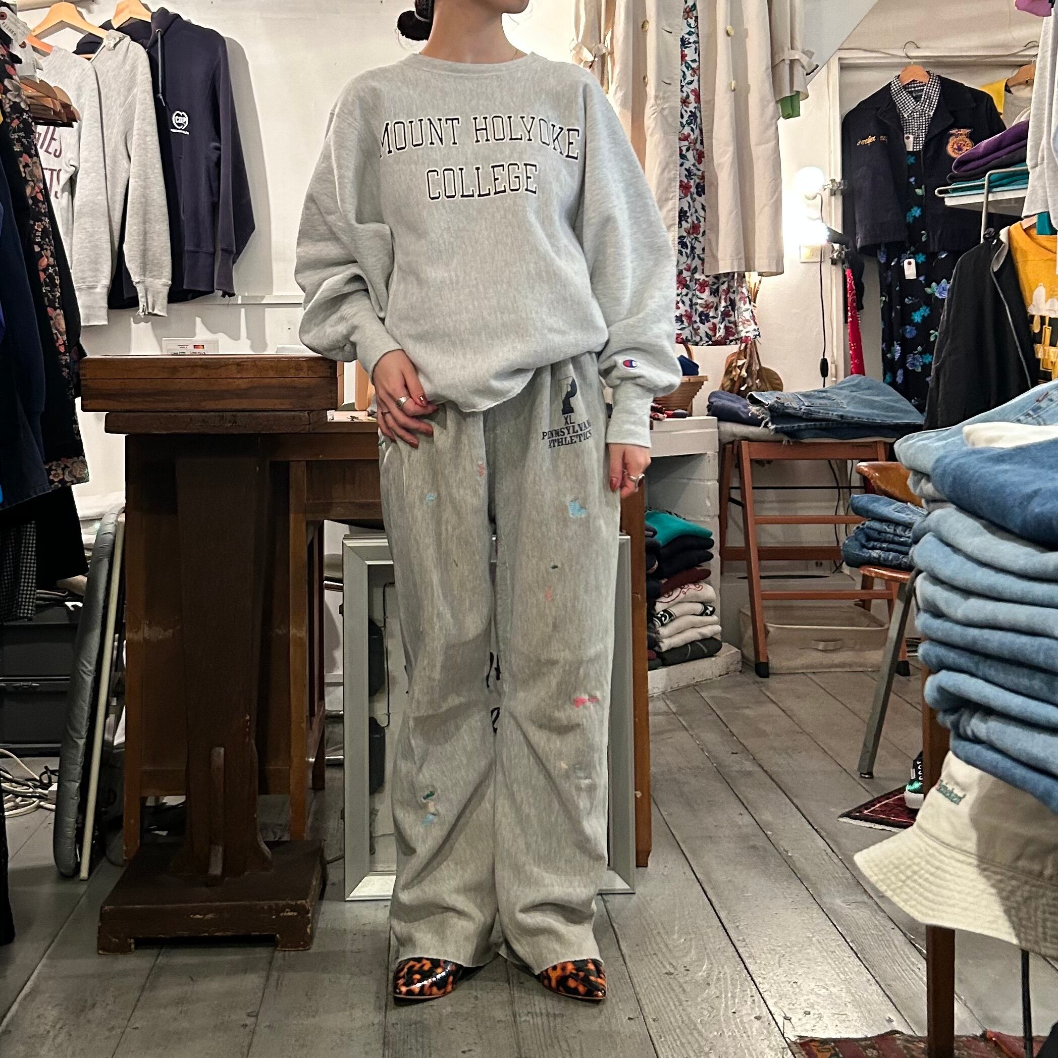 グレーカラーにカレッジプリントのリバースウィーブパンツ。