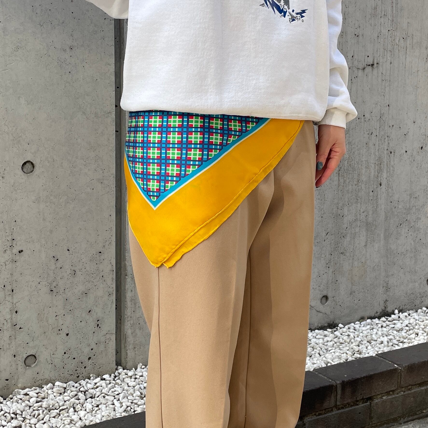 60年代以前のヴィンテージスカーフで品質の良いシルクスカーフに用いられていたディテールですが、こちらの商品の詳しい年代は不明です。