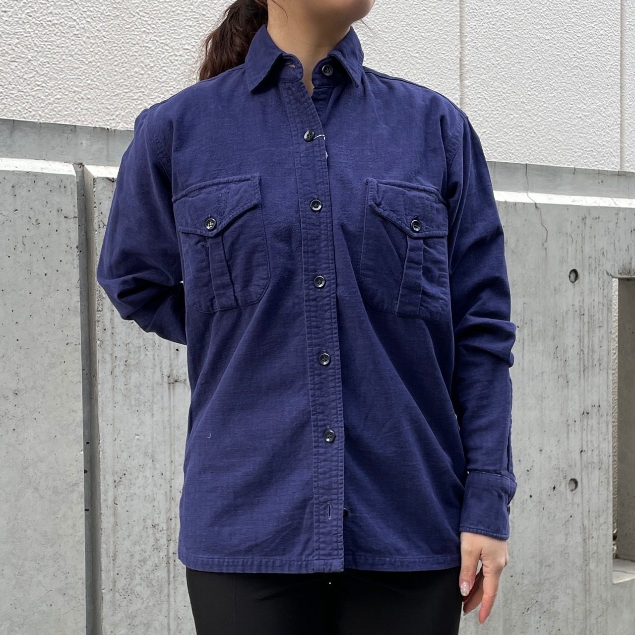 ネイビーカラーのシャモアクロスシャツ。