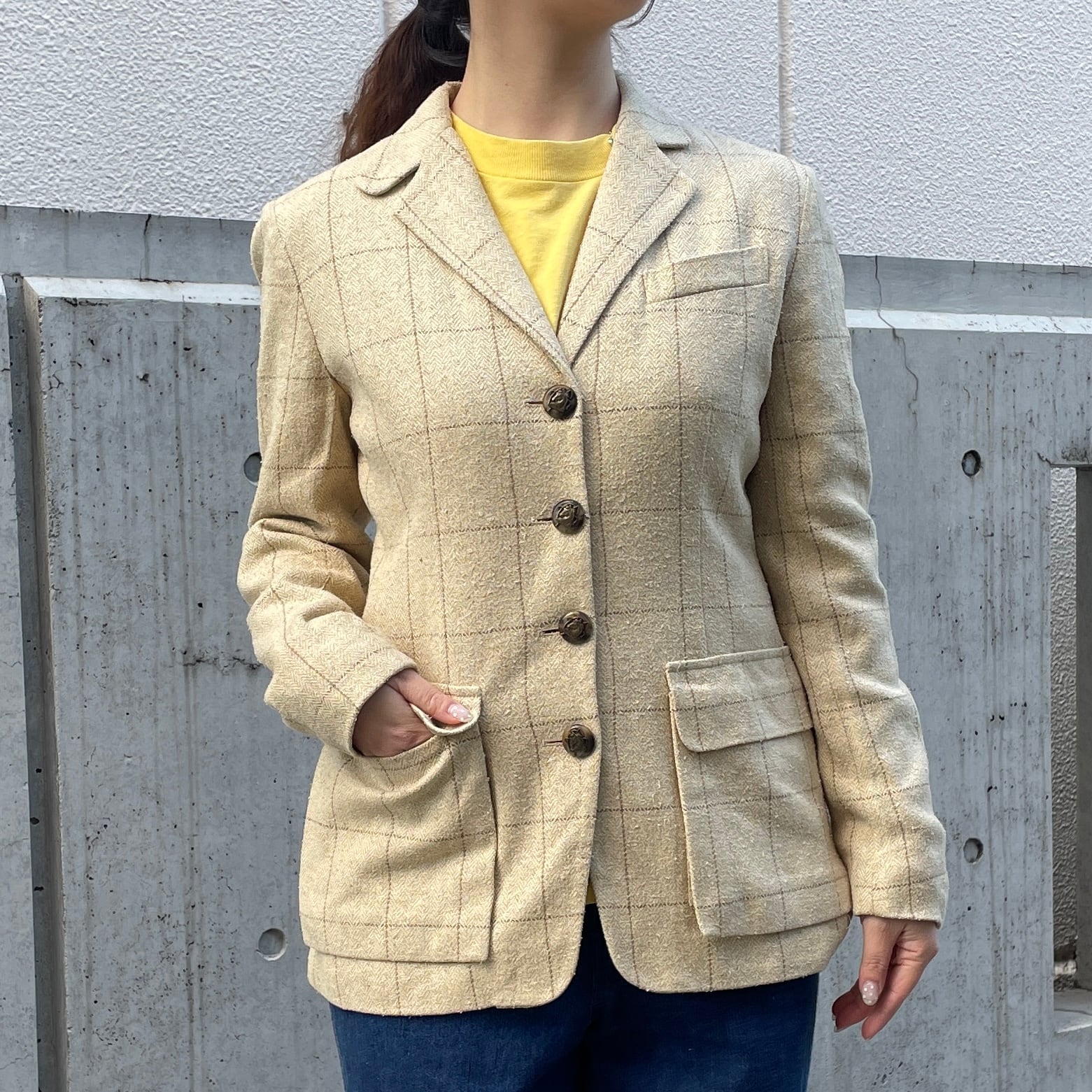 ライトベージュカラーのチェック柄シルクジャケット。