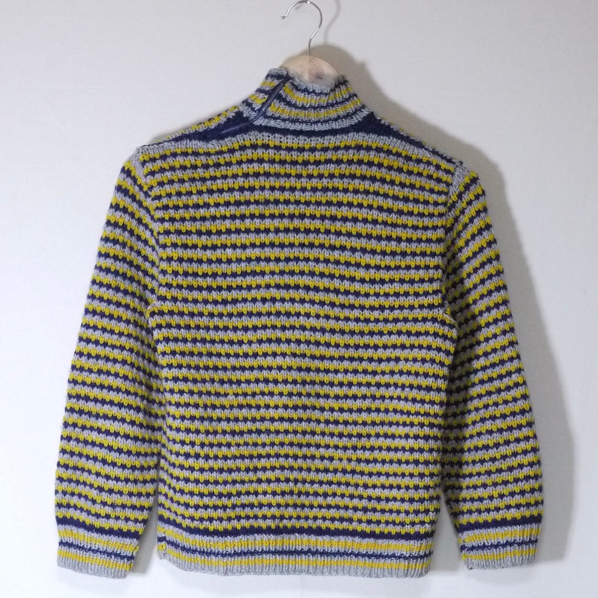 ネイビー、イエロー、グレーのボーダー柄セーター。