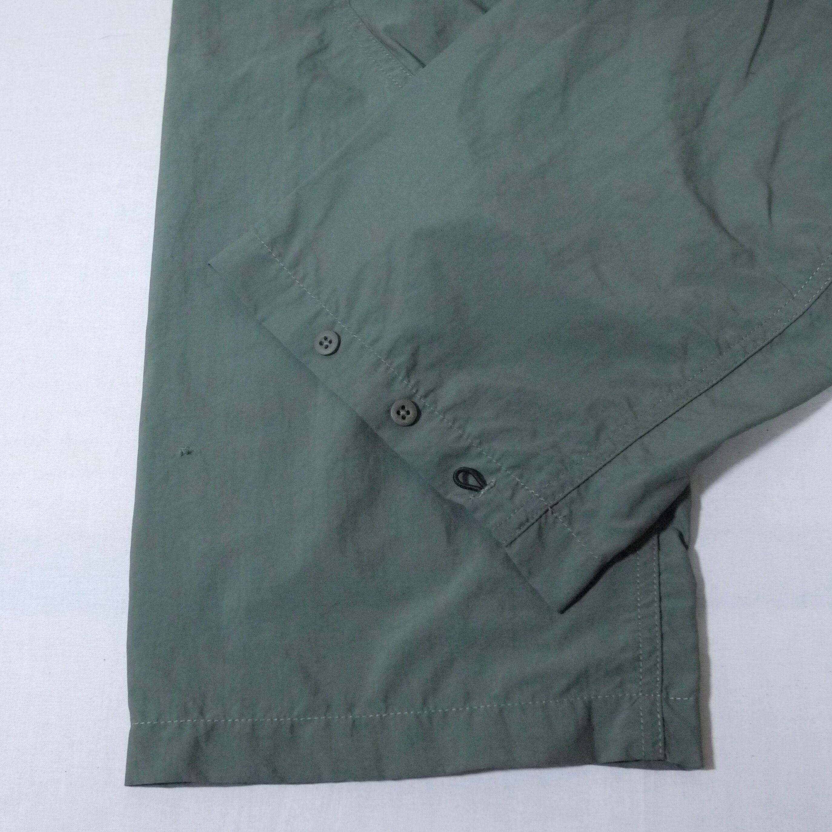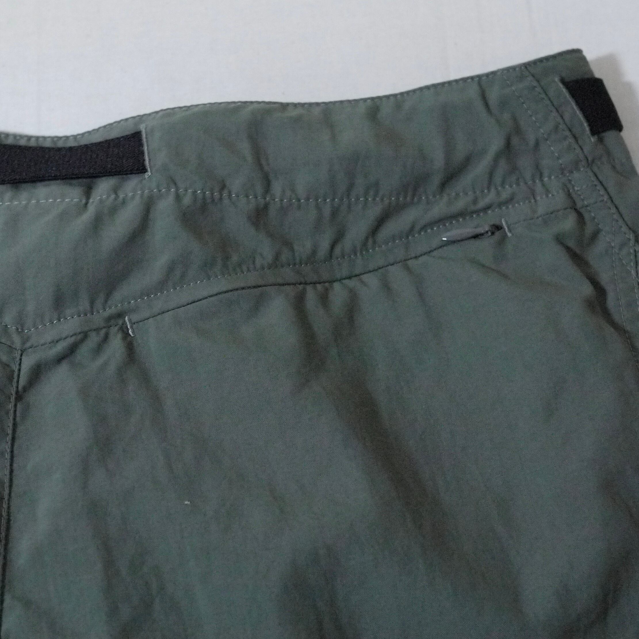 オリーブカラーのナイロンパンツ。