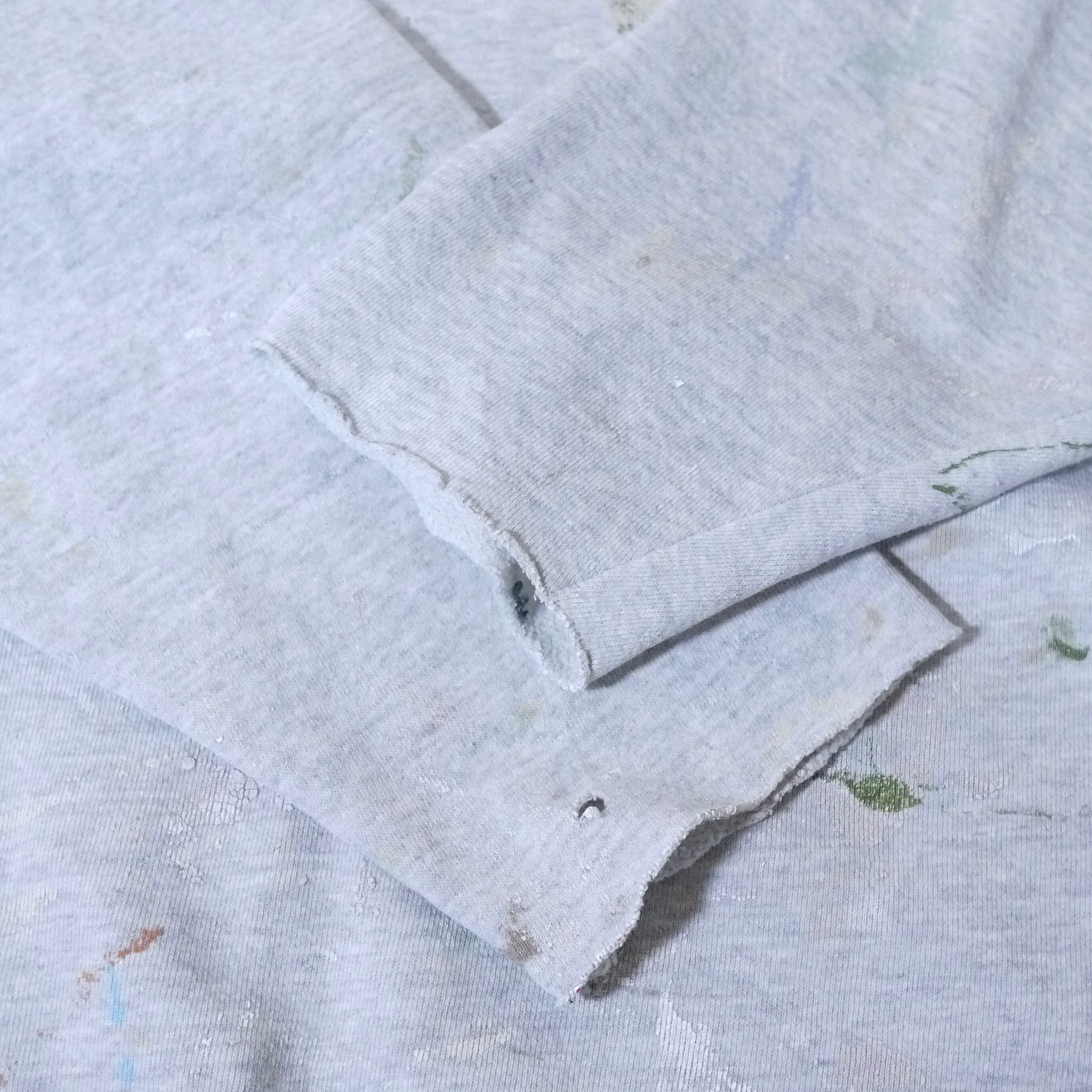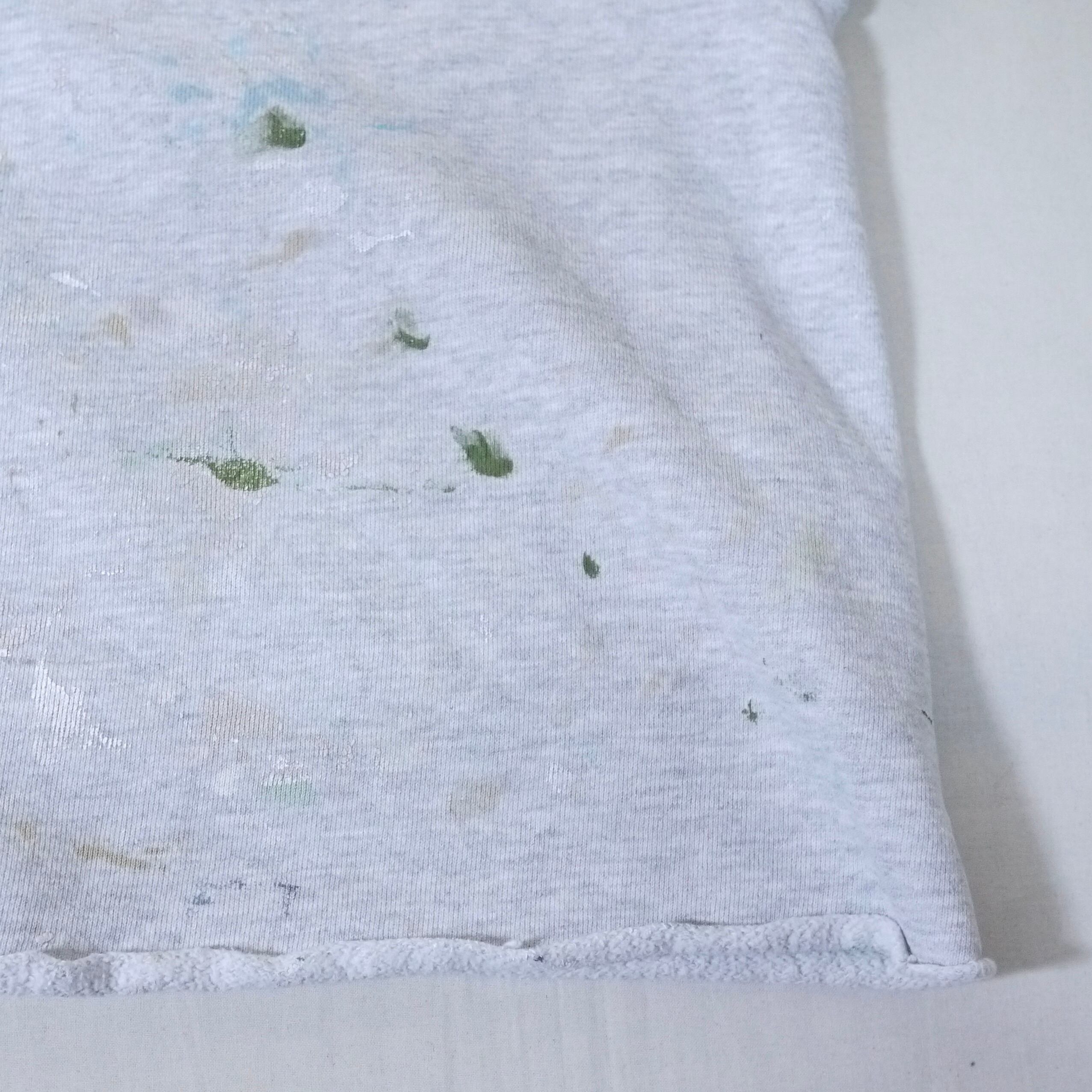 状態は、裾と両袖のリブがカットオフされています。ネックのリブにほつれ、ステッチの外れ。前身頃を中心に全体的にペンキ汚れ。その他、全体的に経年による使用感はありますが、着用に問題はありません。コンディションにご理解頂きアジとして捉えて頂ける方にお願いします。