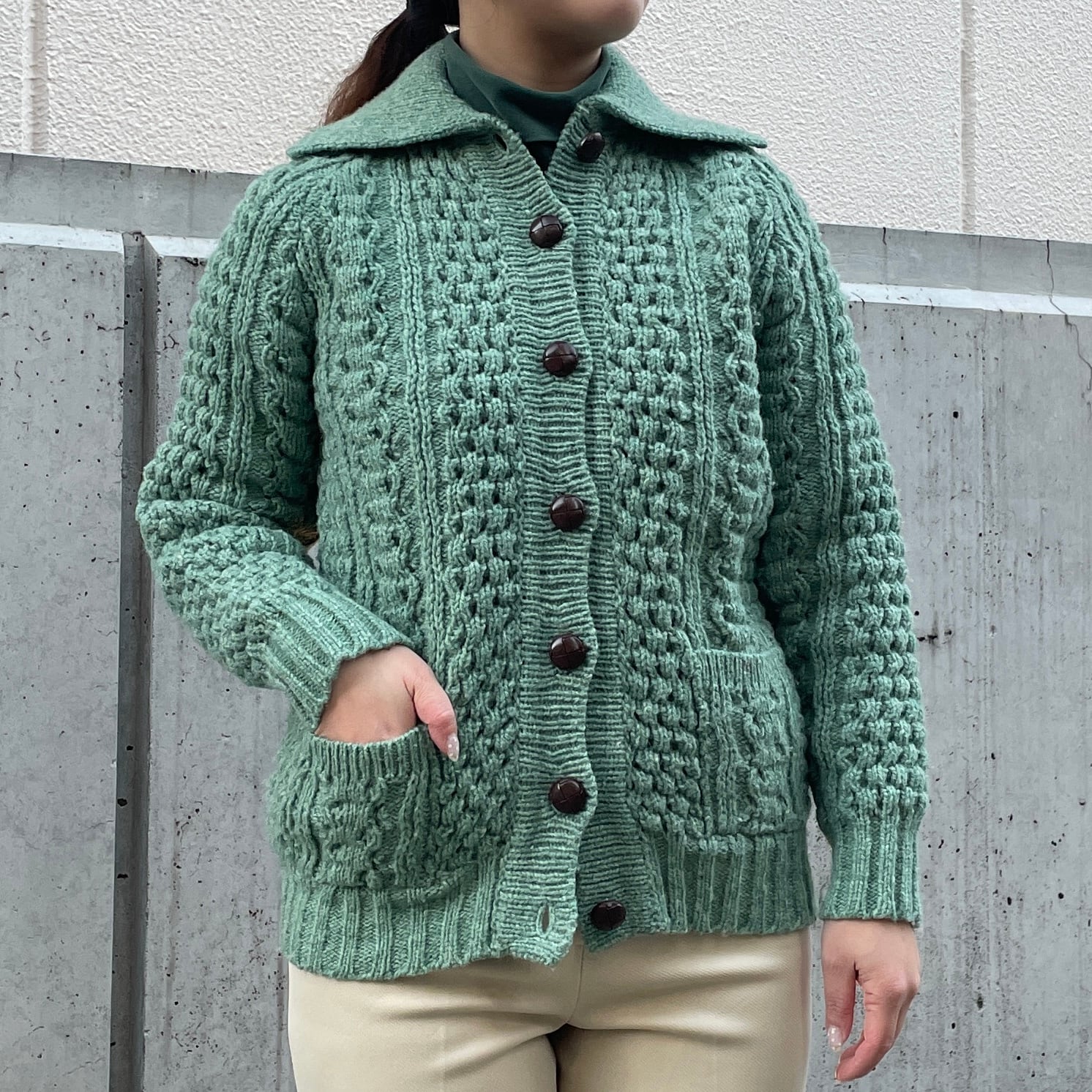 グリーンカラーのフィッシャーマンニットカーディガン。
