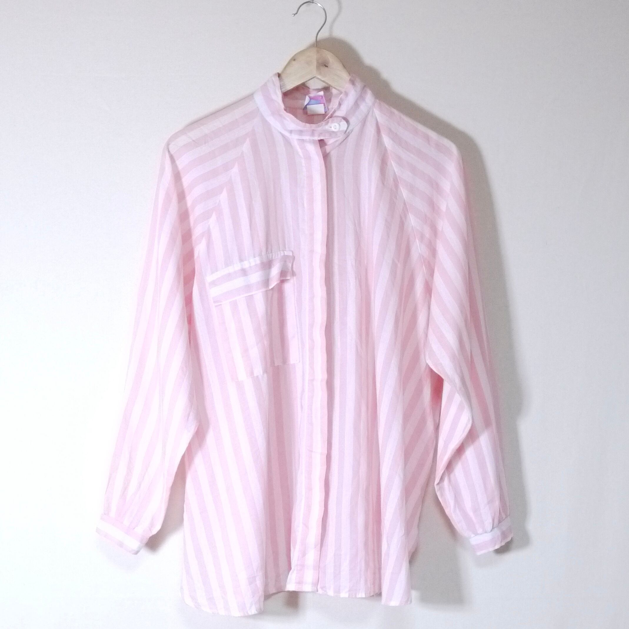 ピンク×ホワイトのストライプ柄長袖シャツ。